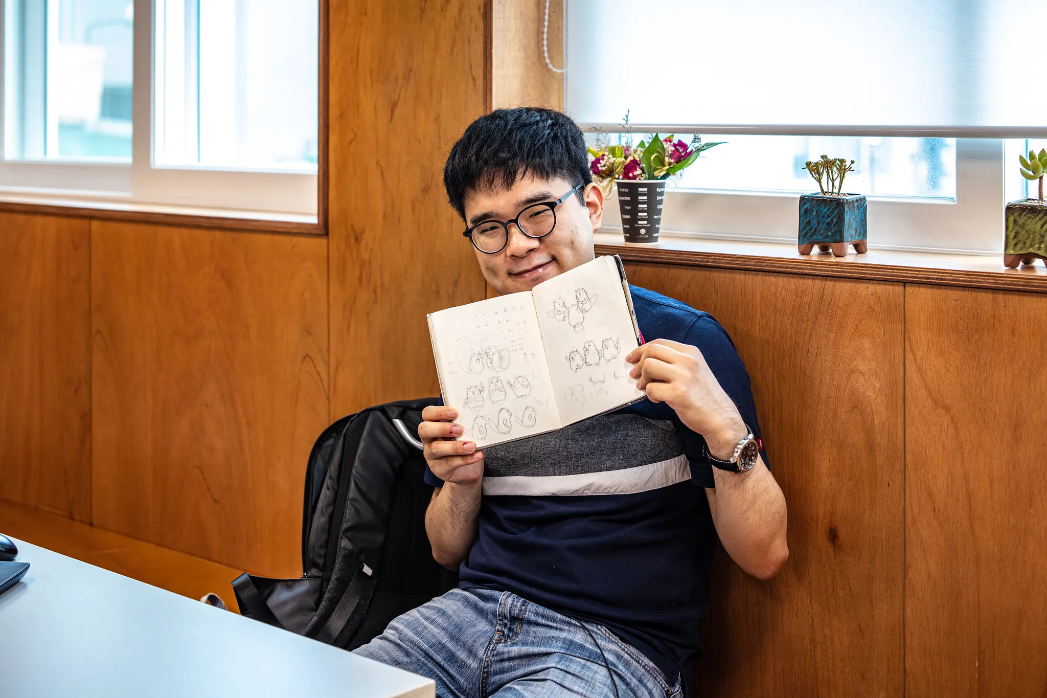 브라보 비버의 탄생이 담긴 자신의 노트를 자랑스럽게 보여주고 있는 박병준 디자이너