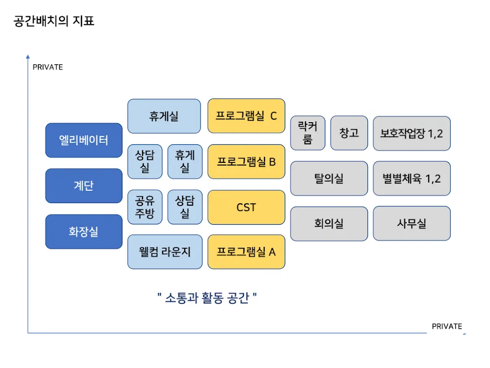 강동 그린나래복지센터 킥오프 미팅에서 공일스튜디오의 건축가(조재원,이현진)이 발표한 첫 자료. 이 프로젝트가 단순한 환경개선이 아닌 ‘지역사회안에서 발달장애인의 균형있는 삶’을 보호작업장의 새로운 운영플랫폼으로 구현하는 것이라는 점을 확인하고, 공감하는 자리였음. 수직(층별), 수평에 어떤 용도의 실을 배치하는가, 선행되야할 의사결정의 주제를 두고, 어떻게 스스로 의견을 내기 어려운 , 공간 경험이 특별한 사용자인 발달장애인 중심으로 공간을 바라보고 계획할 것인가에 대해 논의. 해외에서 발달장애인을 위한 공간계획을 주제로 연구된 사례를 소개하고, 앞으로 논의에 적용되야할 관점과 지표를 공유함.