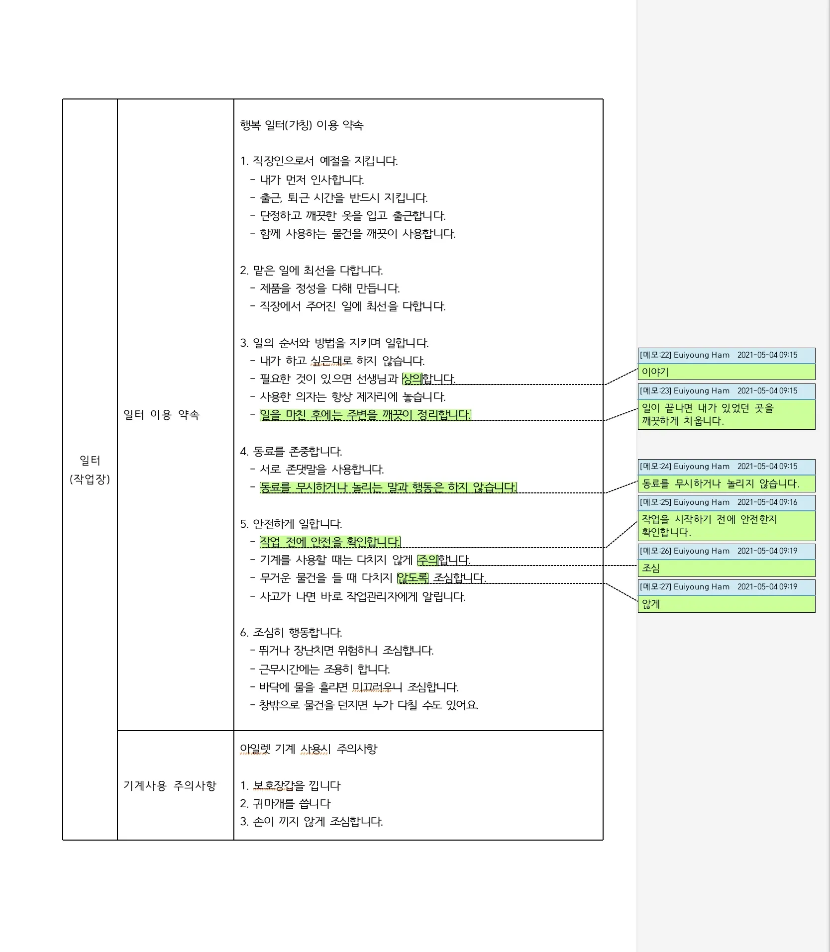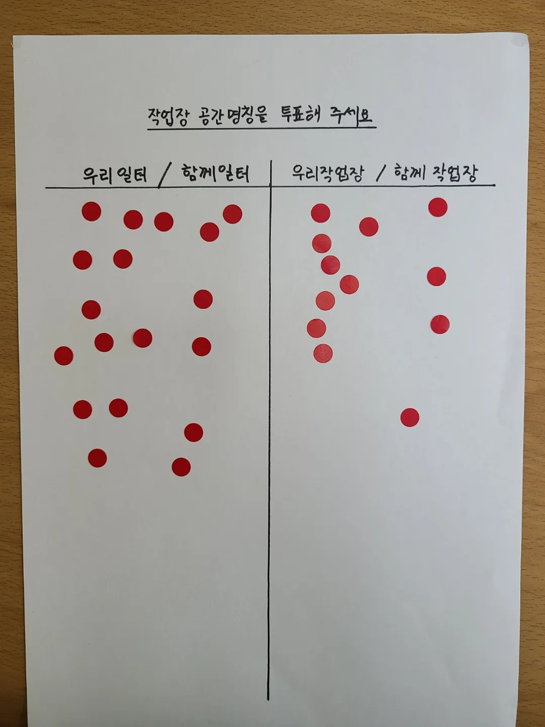 21년 5월 7일 센터에서 협의체 그룹채팅방에 다시 포스트된 글: ‘오늘 작업장 실명에 대한 우리 사원들의 의견을 묻는 스티커투표를 진행했습니다. 오늘은 모든 사원분들이 출근해서 30명 전원이 투표에 참여했고 그 결과 18:12로 일터라는 명칭이 조금 더 많았습니다. 그래서 우리 센터 작업공간을 ‘우리 함께 일터’로 하기로 결정하였습니다~~^^’