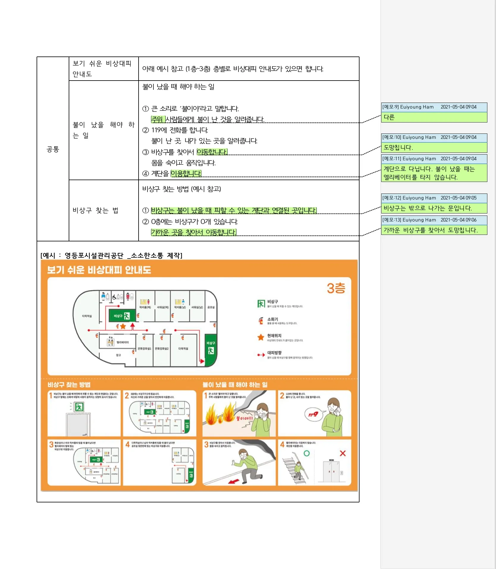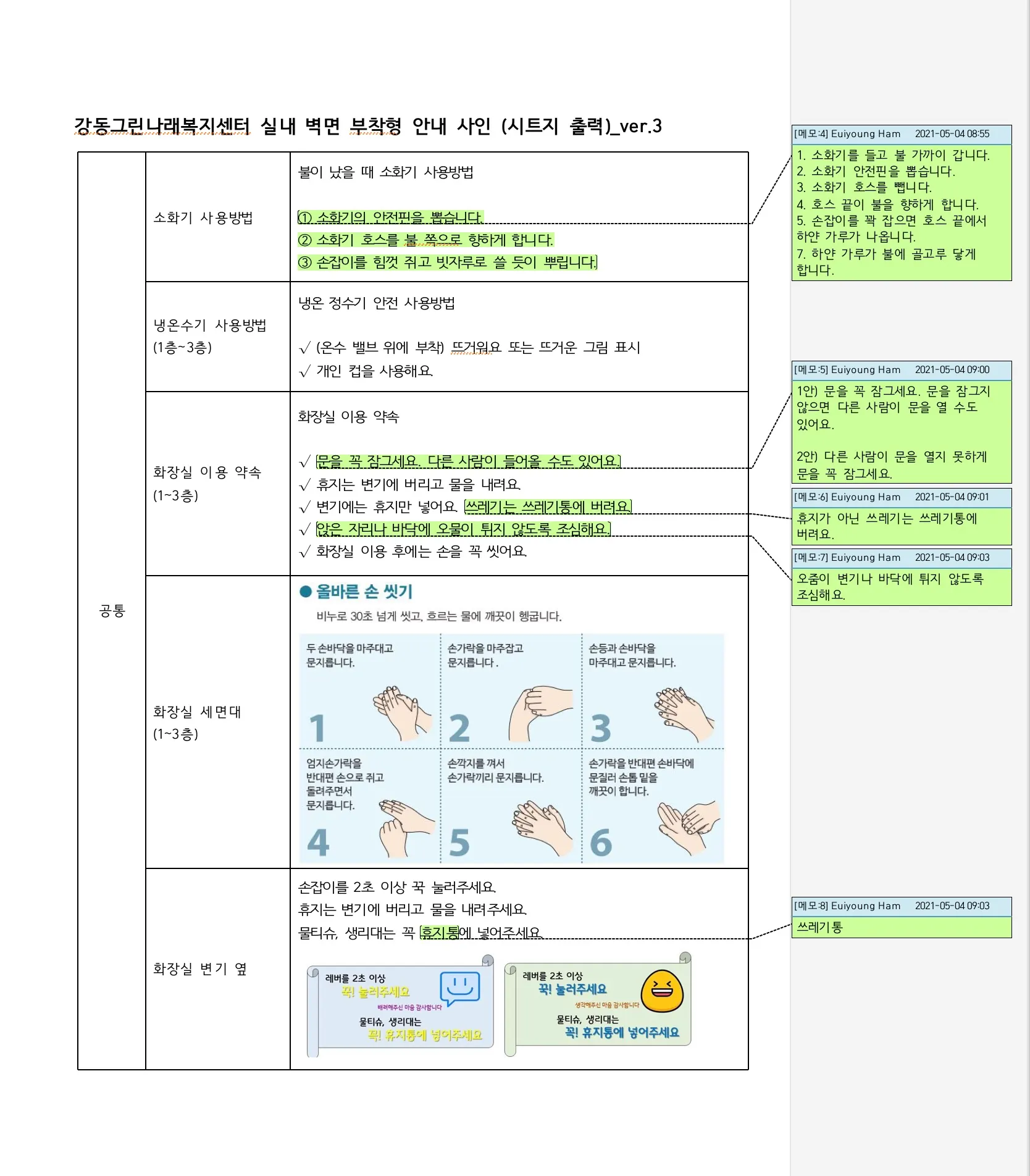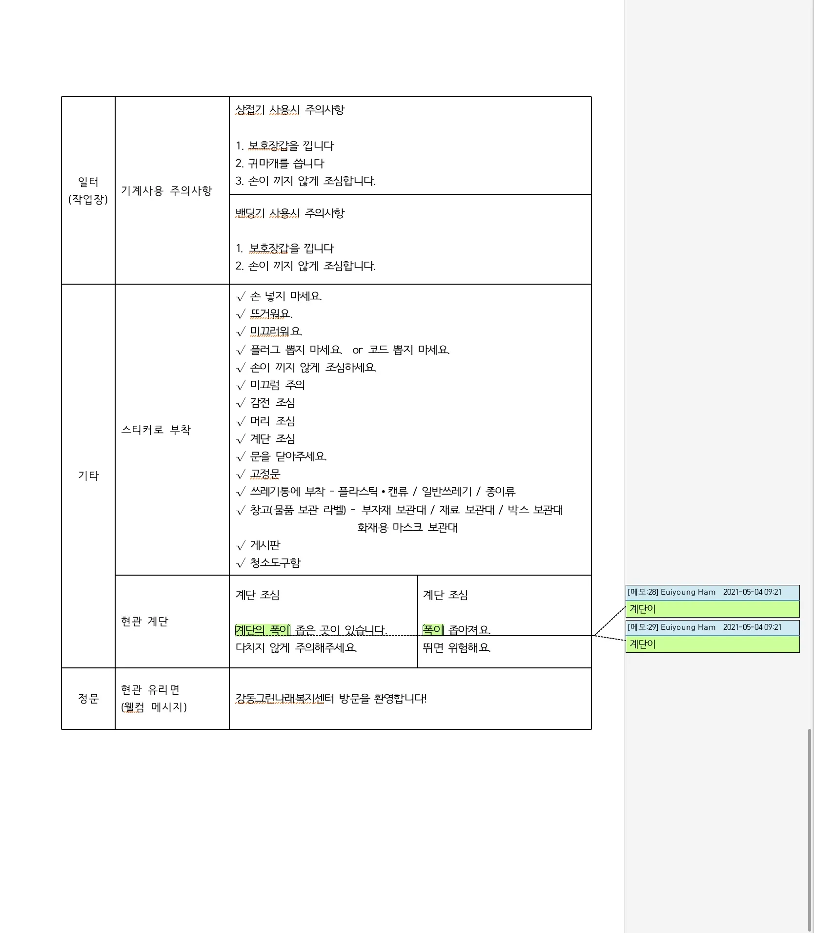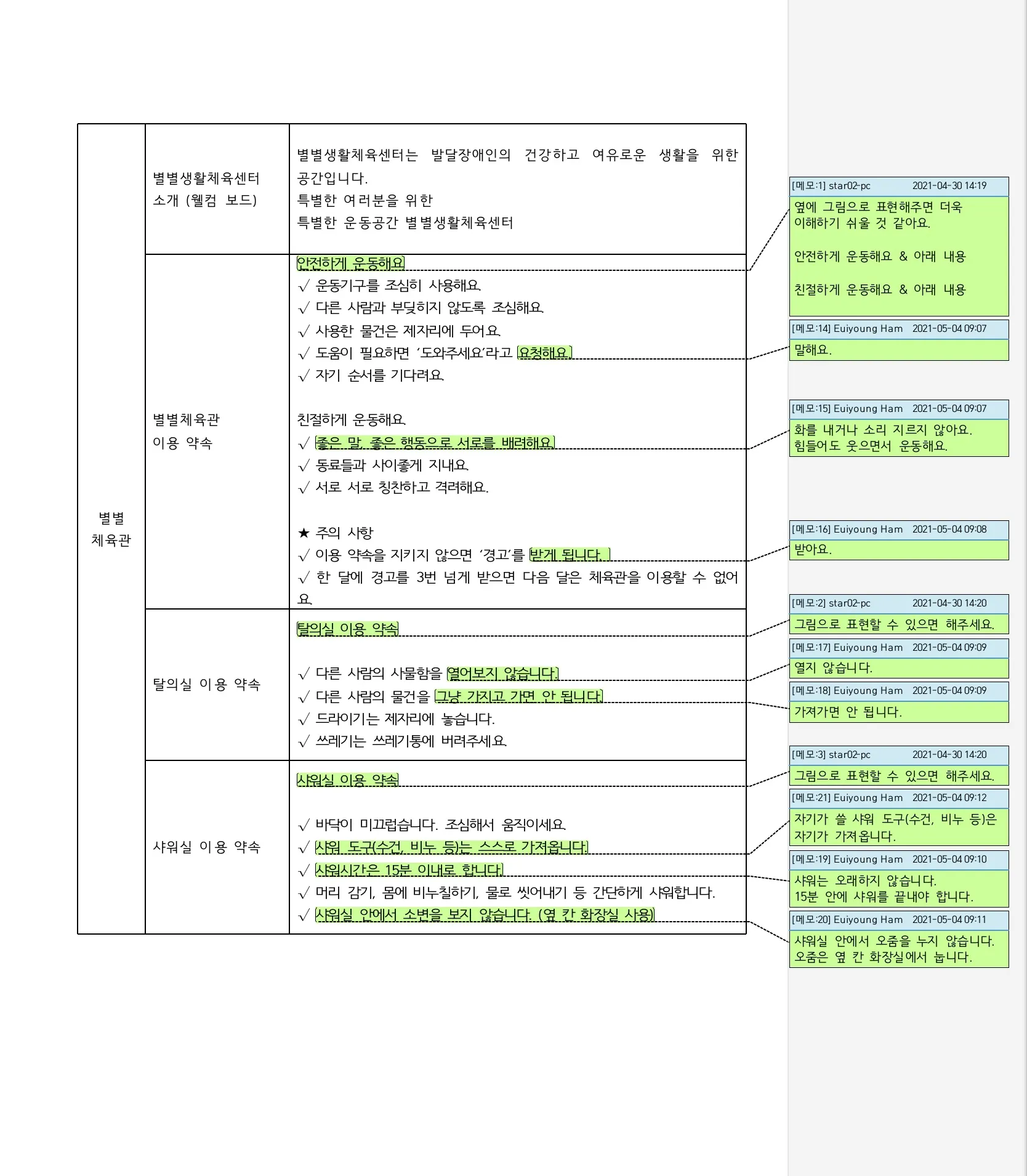 협의체 카톡방에 21년 4월 28일 포스트된 글: ‘안녕하세요? 오늘 강동그린나래복지센터 보호작업장 명칭을 어떻게 정했으면 좋겠는지에 대한 사원들의 의견을 모으는 자치회의를 진행하였습니다. 어제 모든 사원들에게 새롭게 만들어지는 공간을 둘러보게 하고 그 공간이 우리 사원들에게 어떤 공간이었으면 좋겠는지를 자유롭게 페이퍼에 적어보게 하였습니다. 그리고 하루동안 공간에 대한 명칭을 어떻게 정할지를 생각해 보는 시간을 갖게 하였습니다.