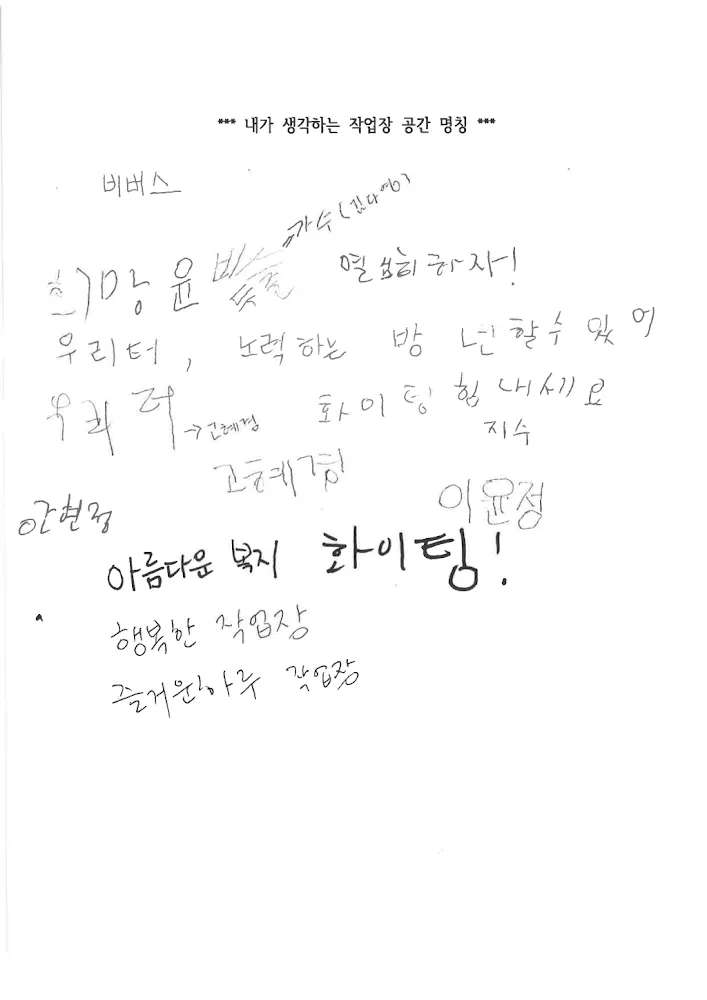 강동그린나래복지센터 공간이 새롭게 만들어지는 의미를 설명하고 보호작업장 명칭에 대한 의견을 나누는 시간을 가졌습니다. 다음은 우리 사원들이 의견을 낸 내용을 정리한 것입니다.