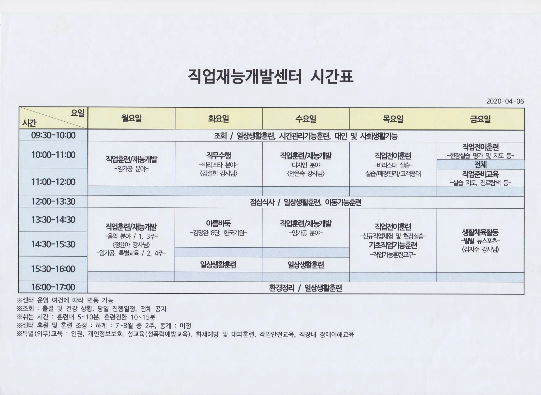 직업재능개발센터는 발달장애인이 보호작업장이나 표준작업장 등에서 직무를 수행할 수 있는 기초적인 훈련을 하는 곳이다. 그렇기 때문에 직무와 생활훈련을 위한 다양한 교육공간이 주를 이룬다. 강동그린나래센터의 초기 기획단계에서는 공유주방과 함께 직업재능개발센터의 바리스타 직무 교육 환경을 조성하는 것을 검토하기도 했었다. 돌봄시설에서의 생활, 직업재능개발, 작업장 일터에서의 직무수행은 단계적 능력개발로 접근하기보다 성인기 발달장애인이 처할 수 있는 다양한 조건에 따라 사회적 참여가 가능한 선택지를 제공한다는 것으로 보는 관점이 중요하다. 따라서, 이들 공간은 기본적으로 생활환경으로서 신체적, 심리적 안정을 주는 것이 기능적인 수행만큼 중요하다는 것을 유념할 필요가 있다.