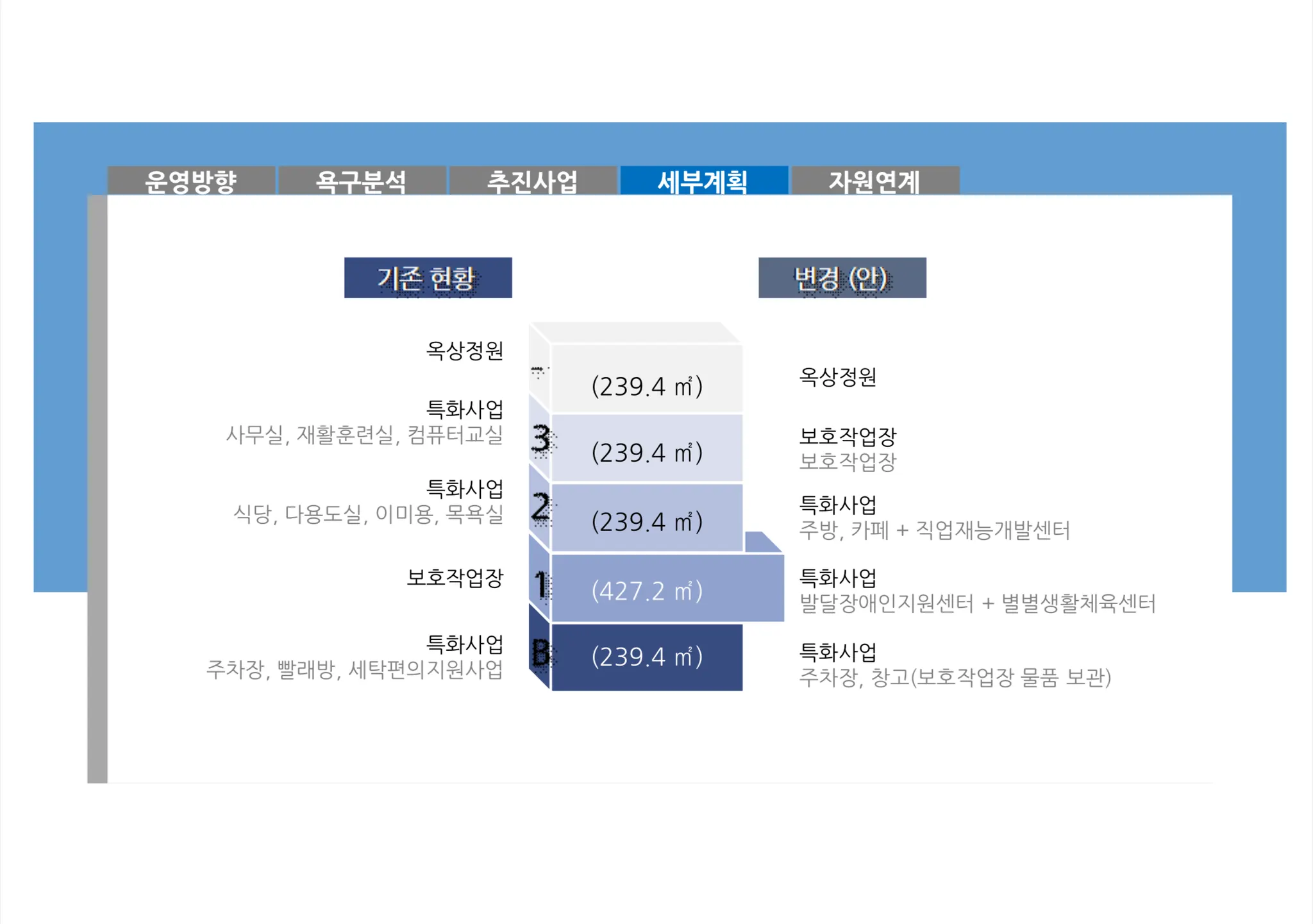 한국자폐인사랑협회는 구립 강동그린나래복지센터의 수탁공모에 응모하여 낸 운영제안서에서 센터를 지역사회 안에서 발달장애인의 균형있는 삶의 플랫폼으로 운영할 계획을 밝히고, 새로운 미션을 수행하기 위해 민간후원을 유치해 공간을 리노베이션하겠다는 계획을 포함했다.
